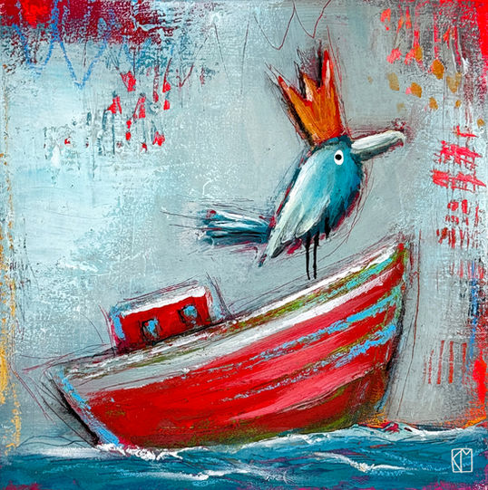 Vögel stehen im Mittelpunkt dieser Arbeiten – nicht als naturgetreue Abbildungen, sondern als Charaktere mit Haltung, Humor und Eigenwillen. Ich arbeite mit Acryl und Mixed Media in mehreren Schichten. Struktur bildet die Grundlage, darauf entwickeln sich Farbe, Linie und Figur. Modelliert, geritzt und überlagert entstehen Oberflächen, die dem Bild Tiefe und Präsenz verleihen.